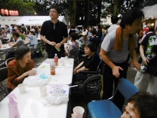 行ってまいりました‼施設から車で1分。八坂神社にて相生3丁目の夏祭に遊びに行ってきました。町会長さんの計らいで一番前の席を確保してくださったり、駐車スペースの確保もしてくださったりと細かな配慮本当に感謝です。おかげさまで車イスの方も楽しめたご様子で、施設に戻ってからも「ありがとう」といわれうれしいこと笑。桐生Ⅲ番館からは9名参加し、(桐生Ⅰ番館、Ⅱ番館さんも参加していました)地元西高校の和太鼓演奏や八木節をみながらの、お祭りメニュー。焼きそば・フランク・冷うどん・シュウマイ・牛ステーキ串。地元のステーキハウスの牛ステーキ串は予想通り大行列。待つこと15分で手に入れた物は皆様のおなかと気持ちを満たされ幸せ~な気持ちに。美味しい~の声頂きました。お祭といって来訪者は少ないかと思いきや飛んでもない。どこに普段いるのだろうというくらいの人人人でした。夏の思いでまたできました(*^。^*)