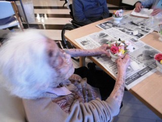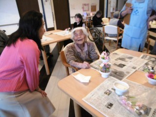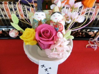 3月15日火曜日の午後、Fairy roseの齋川先生が2回目となるプリザーブドフラワー教室が開かれました。今回はひなまつりをテーマに繭玉をお雛様・お内裏様に見立て華やかなできばえです。1枚目の写真は私自身が作ったものですが、先生が事前に細工してくださっているおかげで初心でもできてしまいました!(^^)!今回参加されたメンバーは13名。作品に名前を貼りそれぞれ思い出としてお部屋に飾っておられました。次回は、5月こいのぼりをテーマに男のが主役です♪