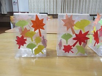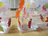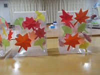 色とりどりの葉っぱを薄いプラスチックフイルムに貼り付けて、今度はそれを立てるように組み立てるのですが、これがまた折り目をしっかり付けるのが力仕事、これも折っているから折り紙になるの?