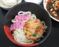 「こどもの日」の祝日ということで、お昼はこいのぼりのかまぼこが乗ったおうどんでした~♬
