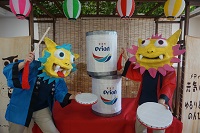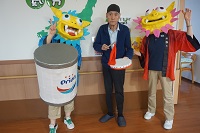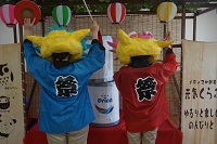 沖縄の守り神のシーサーの被り物は、なんと職員中島さんの手づくりです!