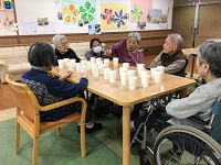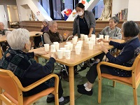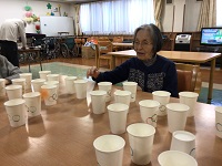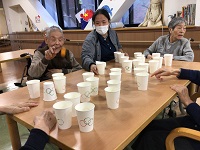 紙コップを並べて、ピンポン玉をバウンドさせて入れるというゲームでしたが、意外に難しくて、みなさま「あ~!」「おしい~!」「何で~!」などとおっしゃりながら、熱心にゲームにご参加されていました♬