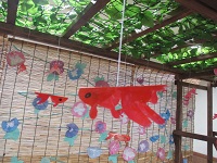 藤棚からアサガオ満開になり、今回さらに金魚と七夕の笹の葉がプラスされ爽やかで涼しげな夏を演出しております!