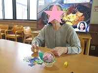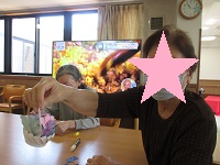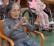 グー・チョキ・パーと順番に出しながら『でんでんむしむしかたつむり』を歌うのですが、今度パー・チョキ・グーと逆に動かすことになると、私もパー・チョキ・パーになってしまい、入居者様に笑われてしまいました…。