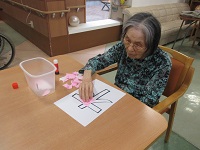 入居者様が日替わりカレンダーに使用する『曜日』に折り紙をちぎって装飾していらっしゃいました♪