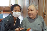 その際、技能実習生のデニさんが着物を着て、師匠が点てたお茶を入居者様に運んでもらいました♪