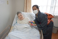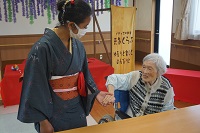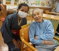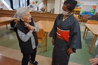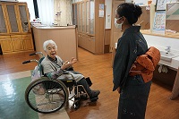 着物姿のデニさんが入居者様のお部屋やフロアに現れると、入居者様は