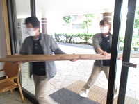 女性スタッフ2人が、何やら木材らしきものを運び込んでます!