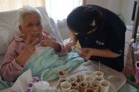 まだ18歳。昨日生まれたようなものですから、「青い山脈」や「東京の花売り娘」などの歌は初めて聴いたと思いますが、入居者様のお好きな歌や民謡を覚えて、入居者様とのコミュニケーションの幅を広げていってほしいと思いました!