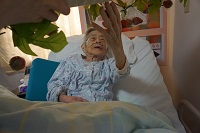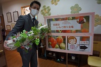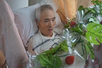 さて、施設で苺狩りを行なったのですが、ベット上でも楽しんで頂けるよう、持ち運び型苺狩りシステムを導入し、入居者様のお部屋へお邪魔いたしました~♪