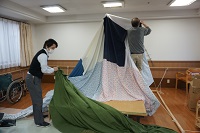 テントにかぶせる布も縫い合せて大きな1枚布を作りました。