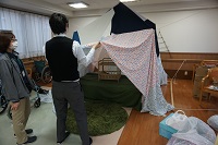 100㎝×110㎝の布を縫い合せ600㎝×440㎝の1枚の布でテントを張り、