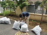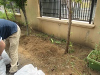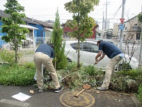 猛暑の中、施設長と営繕さんの男2人組が、お庭の雑草を一掃しようと格闘しております。