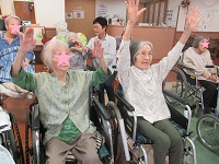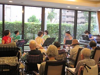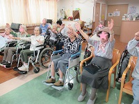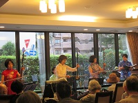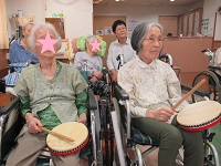 「海」にちなんだ歌や「東京音頭」など季節に合わせた歌を歌い、楽器やスカーフなどの小物を使用しながら、多感覚を刺激する1時間でした。