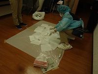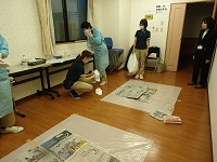 疑似吐物を用いて、実際の嘔吐物処理の方法を体験し、実際に嘔吐物があった際に慌てずに適切に対応ができるようにする目的で行われました。
