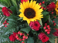 高貴な印象の薔薇と元気いっぱい太陽のイメージの向日葵の2大フラワー代表がお互いの良い所をつぶすことなく、主張し合っています✿