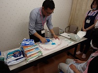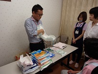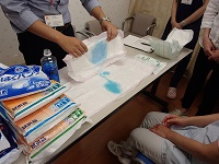 実演を通してオムツの性能や正しい当て方などを教わりました。