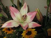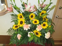 今週のフラワーアレンジメントは、向日葵をメインとし、ゆりとカーネーションも合わさって、とても華やかで豪華な感じです。