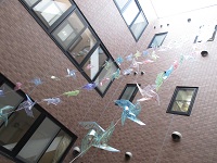 ひとつひとつ手作りの風車をいくつも連ねており、中庭に風が通るたびにくるくると回るところが、