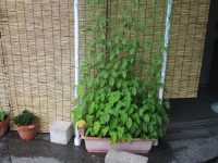 写真は直射日光を遮る簾の設置です。ついでに外には朝顔がすくすく育っています。