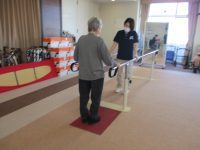 リハビリ中に正面からカメラを向けると緊張されると困るので、リハビリの時は大体後ろ姿か横向きで摂っています。それか座ってリラックスしている所ですかね。この方は、平行棒につかまりつま先立ちの練習。