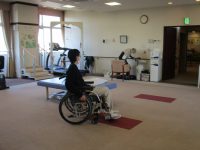 リハ室を覗きに行くとリハビリスタッフが車椅子に乗っているところ