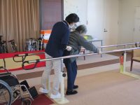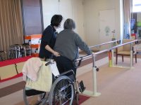 今日の方は、平行棒を使っての立ち上がりと、まだまだ、リハビリスタッフのサポートを受けての歩行訓練中