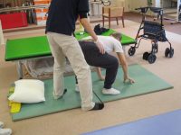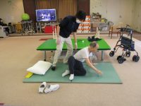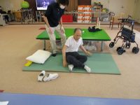 自力で座って、仰向きになって起き上がり、立ち上がる為の姿勢作りから立ち上がり、立ち上がったところには手すりがないのでリハビリスタッフが手すり代わりに立っています。座るときはこの逆の動作を行います。