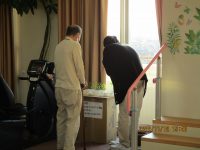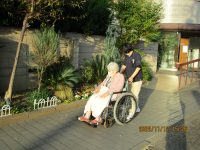 実は、とっさに写真を撮ったのですが、立っているスタッフの陰にもう一人ご家族を待つご入居様がおり、その方とリハビリのことについて話をしていた後のひと時でした。さぼりではありません。
