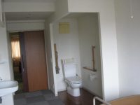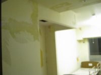 写真で写すともともとの壁紙が白かったためか、逆に汚しているようにしか映っていませんが、換気口のグレーチングを外したり、照明の傘を外したりして古い壁紙をはがしてあるところです。