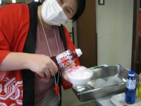 かき氷はイチゴにメロン、ブルーハワイ、レモンにマンゴー、それぞれに練乳をかけてのバリエーション、丸山施設長のおすすめは、初恋の味のイチゴ、丸山施設長の初恋の味も・・・