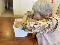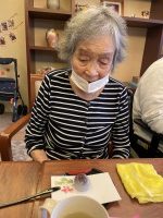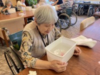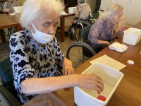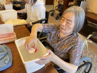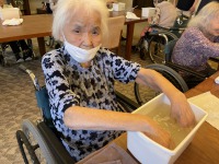 水まんじゅうが冷えるまでは、前回作成したバスボムを使った手浴の時間。