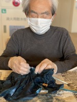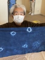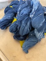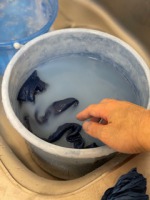 その後、藍の固定液を投入した溶液に浸して絞り、乾かして完成です。