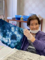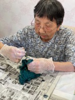 藍が手に付かないよう、入居者様には手袋をして頂きました。