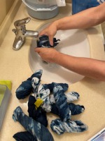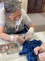 加工をし、水に浸した手ぬぐい生地を藍を溶かした液体へ。l