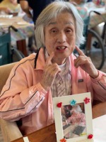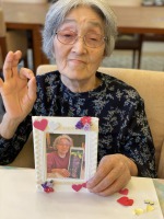 完成したフォトフレームを前に、満足気な表情が素敵です。