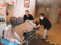 避難誘導訓練は、スタッフを入居者様に例えストレッチャーで安全に避難できるように訓練を行いました!!