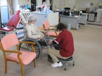 まだまだ慣れない動きをリハビリスタッフと一緒にされている方や、下肢のもみほぐしをされている方、自主的にストレッチされている方などです。