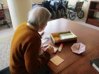 リハビリの様子を撮りに、6階に上がったところ、陽当たりの良いラウンジで折り紙を使っている入居者様を発見いたしました。