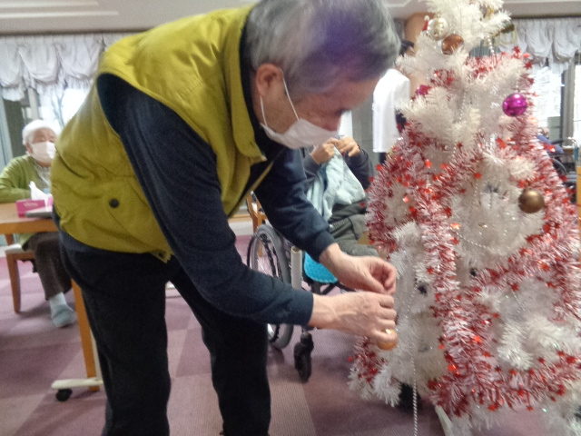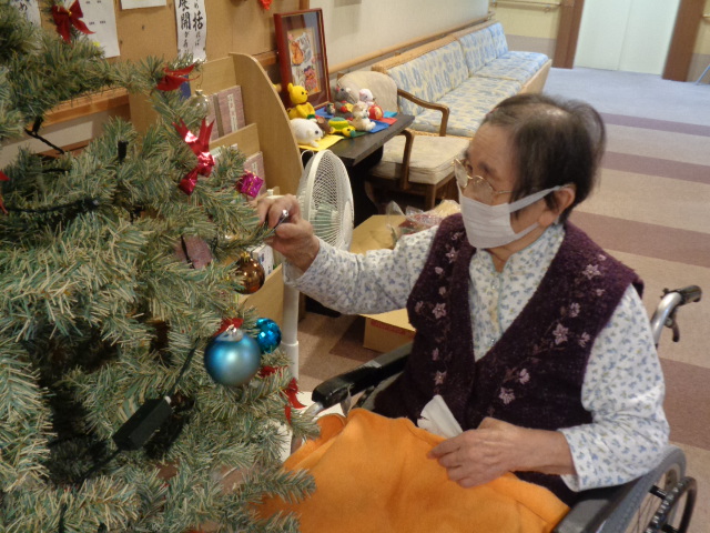 入居者様にクリスマスツリーの飾りつけを