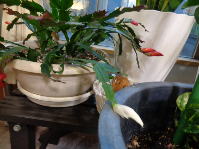 赤シャコバサボテンの鉢から白シャコバサボテンの花が咲きました😊