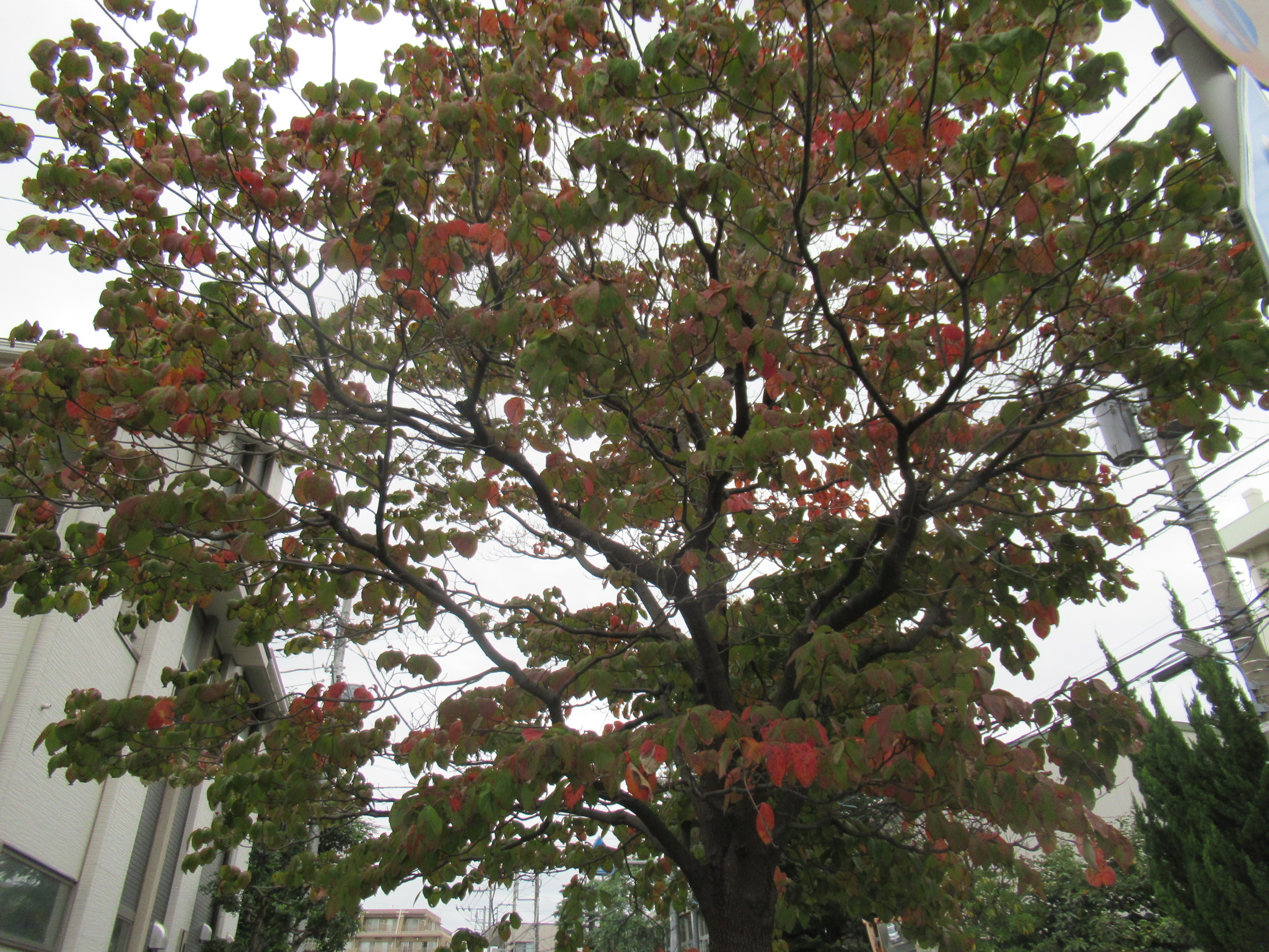 街路樹のハナミズキに赤い実が付き、少し紅葉し始めました。