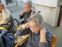 上半身を中心に首や腕を回したり、タオルを使って背筋を伸ばしたりしました。