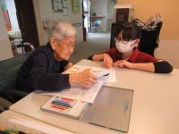最近とても仲良しで、食事用のエプロンをたたんでくださったり、おしゃべりをしながらぬり絵を楽しんでいらっしゃいます。