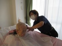 大きめのケープを使い、髪の毛が衣類やお布団につかないようにしっかりガードをしておこないました。