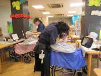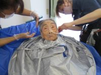 クッションなどを使って体勢を整えて、2人の美容師さんが15分ほどでカットしてくださいました。