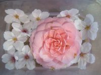 落ちていた椿と桜を拾い、水に浮かべて飾りました。