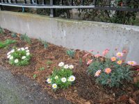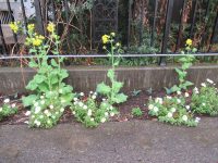 施設前の小学校の花壇に菜の花やチューリップの芽がで始めました。