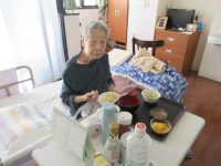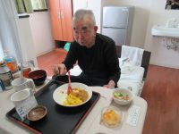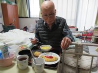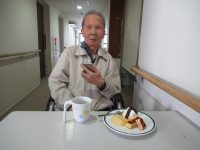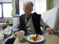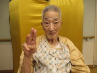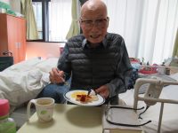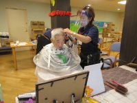 kさんは、前回は入居したばかりでベッドで散髪しましたが、元気になられて車椅子に座って散髪されました。