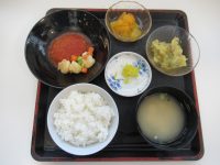 メニューは、ご飯・味噌汁・鶏のから揚げ・冬瓜の煮物・フルーツ・漬物でした・